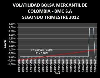 Observando el grafico de comportamiento de la acción de la Bolsa Mercantil de Colombia S.A y comparándola con el comportamiento del mercado en este periodo, se advierte que en el mercado predominó en este trimestre una actitud decreciente, mostrando una curva de tendencia lineal con una pendiente de -32.48. También se puede percibir, que este activo presentó un comportamiento igualmente negativo, con un ángulo de – 0.56. La volatilidad que presento en su evolución esta acción en este trimestre resultó poco interesante para el inversionista, pues se encontró un reducido movimiento con relación a la curva que define la tendencia lineal.